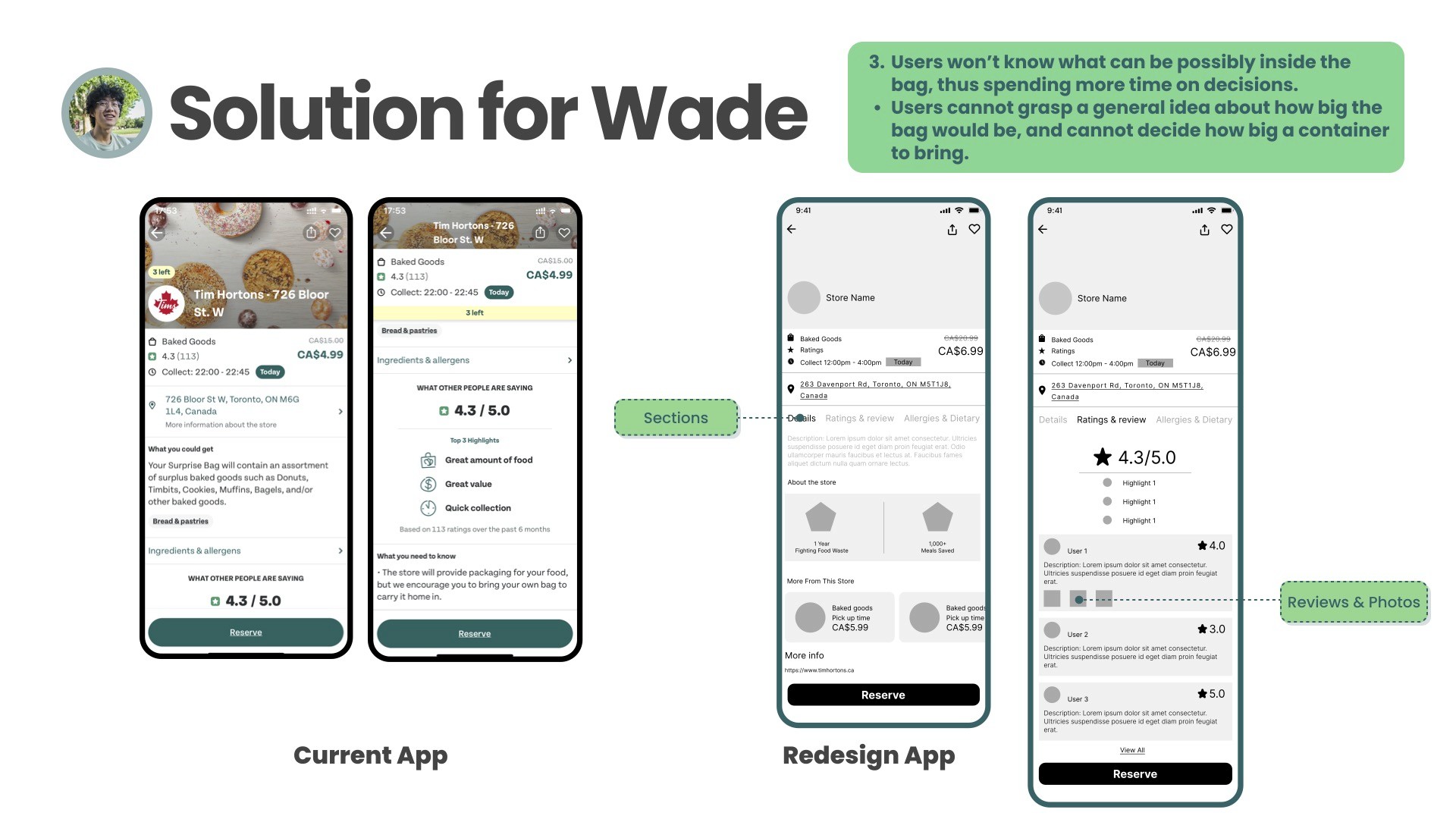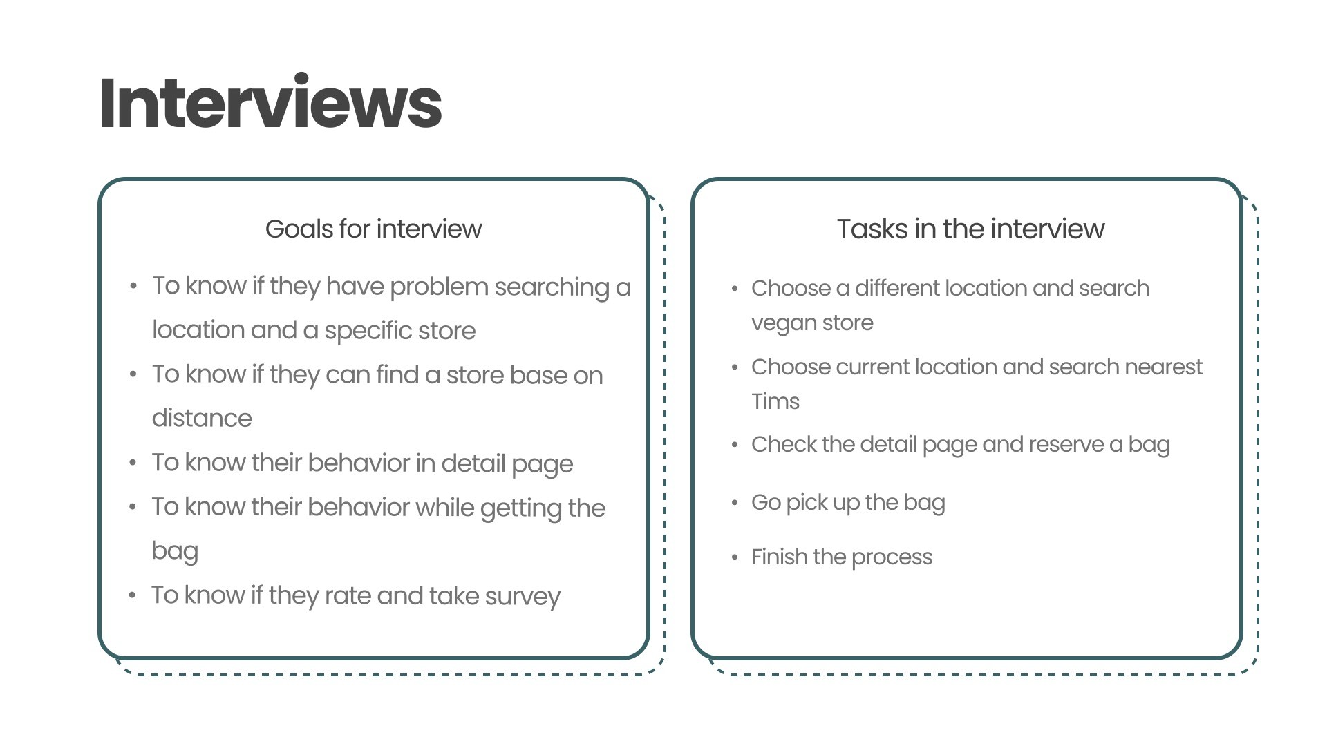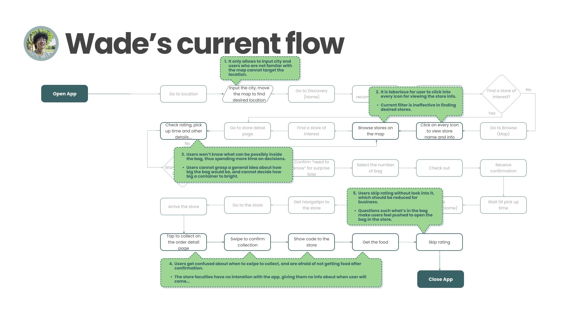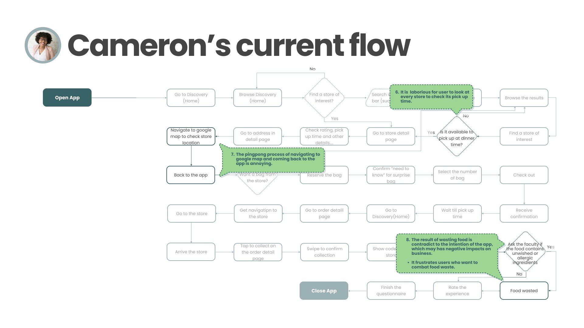 User Interviews: Observed participants performing tasks such as searching for stores, reserving, and collecting bags. I documented issues like difficulty using the map, missing dietary info, and uncertainty during pick-up.